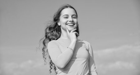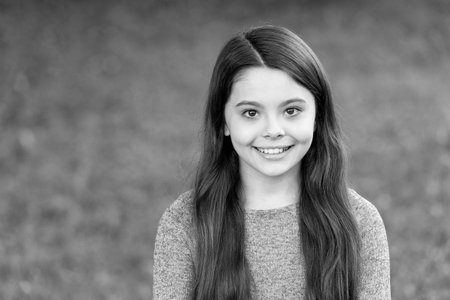 Fall fashion style for teen. Complete outfit style. Girl face in casual sweater. Long healthy hair. Teen girl with long hair outdoor. Autumn fashion girl. Trendy and stylish teenager cheerful girl