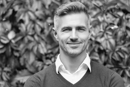 Businessman portrait outdoor. Smiling mature business man. Autumn portrait. Businessman in autumn park. Caucasian man has business casual style. Mature man face portrait. Copy space