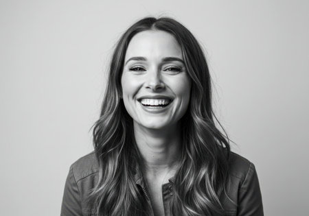 A monochrome portrait of a woman with long, wavy hair smiling broadly. Her expression is joyful, and her teeth are visible. She is wearing a collared shirt, and the image is focused on her face and upper body.