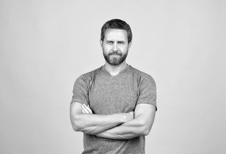 handsome mature muscular man with beard smiling on yellow background crossed hands, male beauty