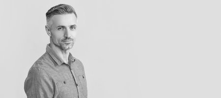 Man face portrait, banner with copy space. smiling mature man with graying hairstyle on yellow background, hairdresser.