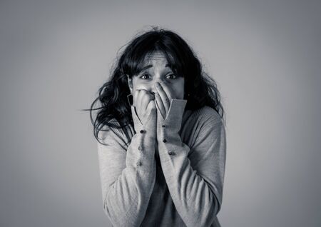 Close up portrait of scared and shocked young woman receiving bad news and looking with fear in her eyes at something scary. People and Human expressions and emotions concept. Studio shot.