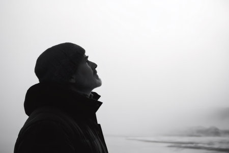 Black and white profile of a senior man wearing winter clothes and breathing fresh air in a foggy winter landscape