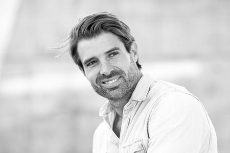 Black and white image of a man with a beard and styled hair wearing a shirt, smiling in a close-up view with a blurred urban background