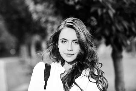 Girl sunny portrait. Happy smiling woman outdoor. Fashion.
