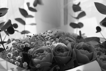 Bouquet of bush roses as a background black and white photo, flower arrangement, festive bouquet