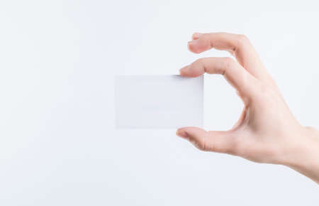 Female hand holding a blank business card over white background