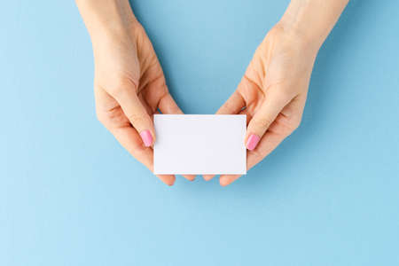 Woman's hand holding business card on blue background. Mockup. Close up