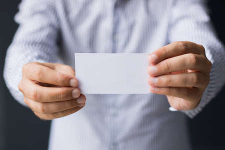 Man's hand showing blank white business card. Man holding business card.