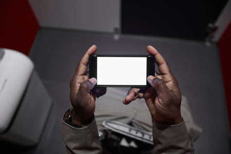 Top view closeup of unrecognizable African-American man using smartphone while sitting on toilet in public restroom, copy space
