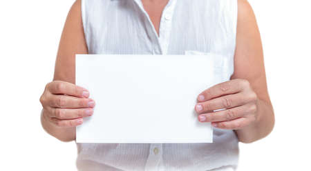 Woman holding piece of white paper with copy space isolated on white background