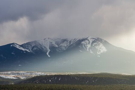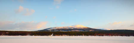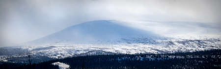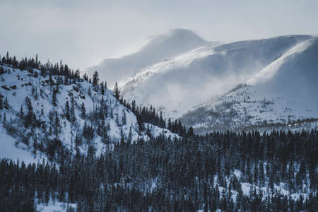 Beautiful winter landscape with snow covered mountain peaks and coniferous forest