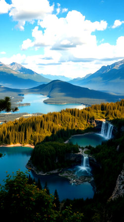 A stunning mountain landscape with a serene lake reflecting the majestic peaks and lush forests under a bright blue sky, ideal for nature enthusiasts.