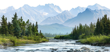 Snowy mountains of Alaska, landscape with forests, valleys, and rivers in daytime. Breathtaking nature composition background wallpaper, travel destination, adventure outdoors