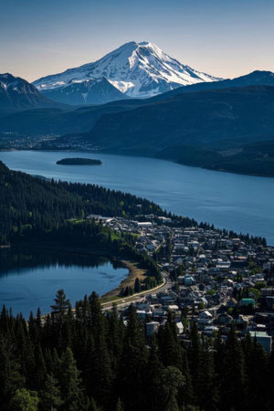 Summertime in Ketchikan Alaska area. Partially snow covered mountains along side a winding blue waters and green colors.