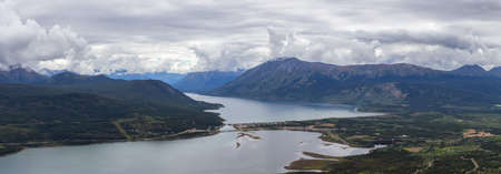Beautiful Panoramic View of a small Touristic Town, Carcross, surounded by Canadian Mountain Landscape. Located near Whitehorse, Yukon, Canada.