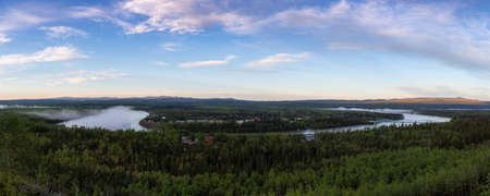 Panoramic Aerial View of a small town, Pelly Crossing, during a sunny and cloudy sunrise. Located in Yukon, Canada.