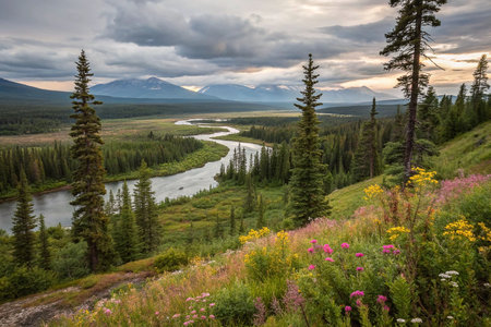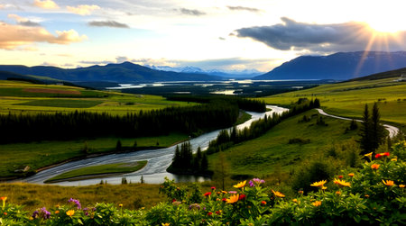Serene river valley landscape at sunset, wildflowers, mountains.