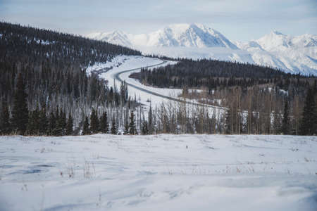 Scenic Route, Alaska Hwy, during a sunny and cloudy day. Mountains in Background. Near Haines Junction, West of Whitehorse, Yukon, Canada.