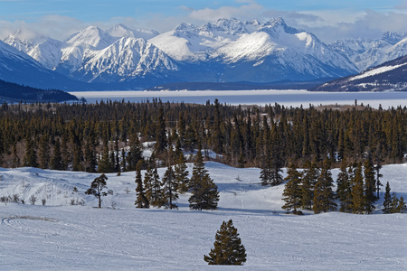 Winter landscape of mountains, lakes and forest in Yukon, near Carcross