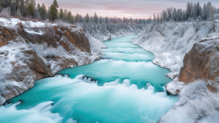 Fantastic winter landscape with snowy fir trees on the shore of a frozen mountain river at sunset