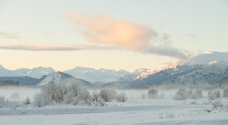 The Chilkat Valley under a covering of snow, with mountains behind. Southeast Alaska.