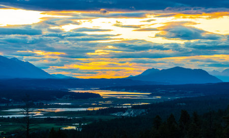 Seasonal color of landscape with forest, mountains and rivers in autumn colors in Alaska during sunset