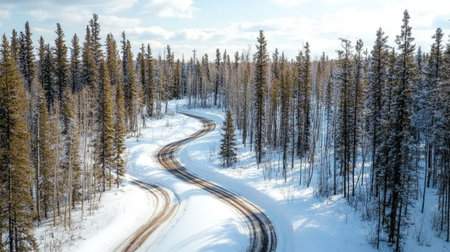 AI Generated. Aerial view of frozen lake surrounded by snow covered trees landscape