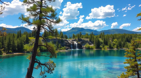A refreshing lake scene where a waterfall pours over smooth stones into a clear basin.