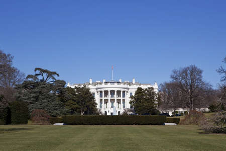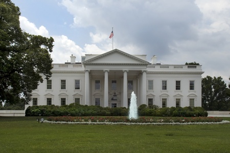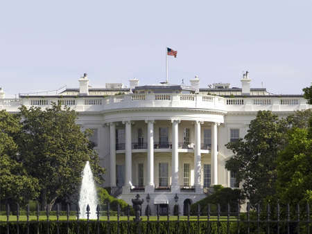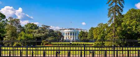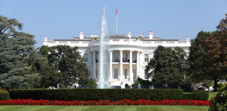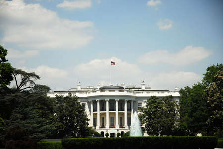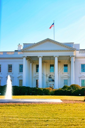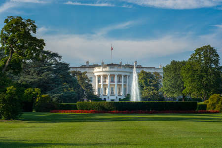 Front view of the White House with American flag and green lawn on a sunny day in Washington DC. g.