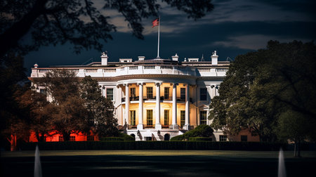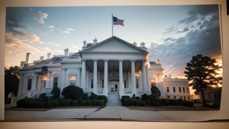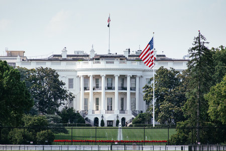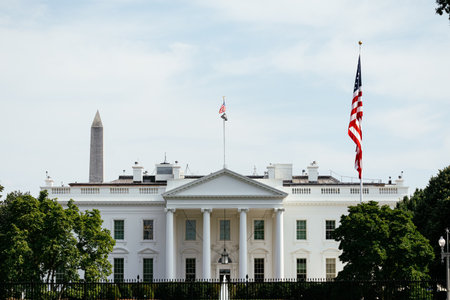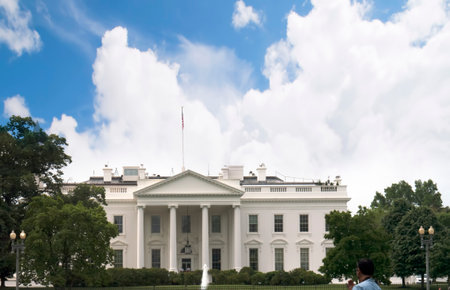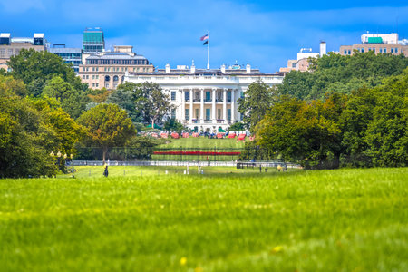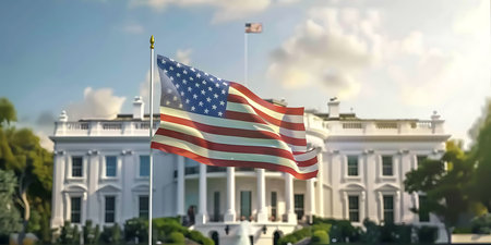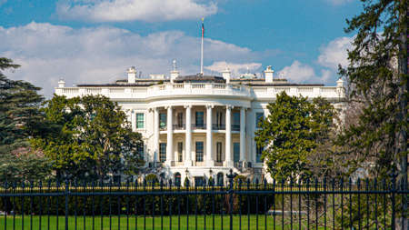 White House US presidential election American flag iconic building front view with garden trees blue sky clouds background