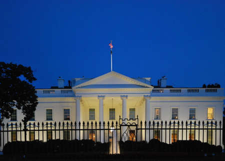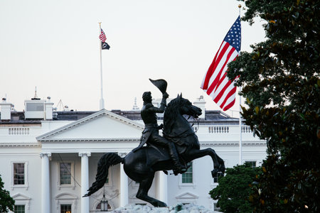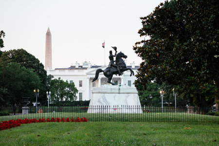 White House with Andrew Jackson statue and US flag, Washington DC landmark at dusk. c.