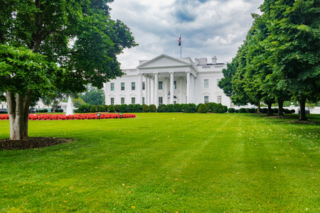 View of the White House - the President's residence in Washington, DC, Manicured lawn and oak trees in the garden