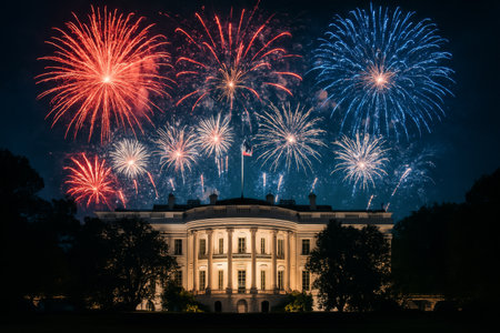 The White House, Washington DC of beautiful colorful holiday fireworks in the evening sky with majestic clouds