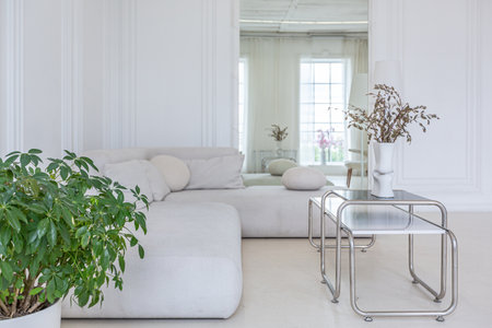 Bright and airy living room featuring a white couch, small table, and a decorative plant, creating a serene and elegant minimalist atmosphere.
