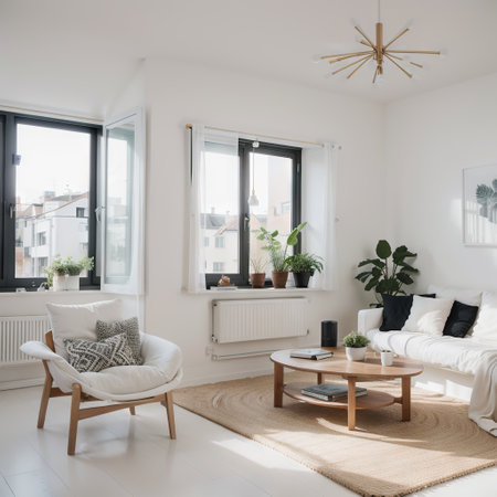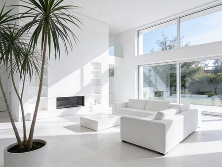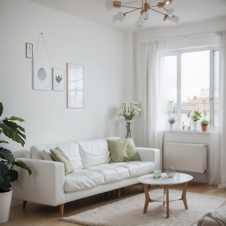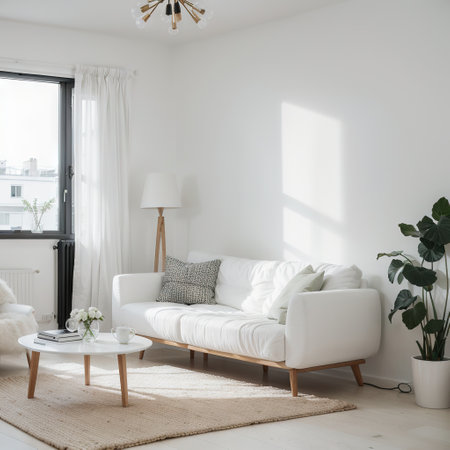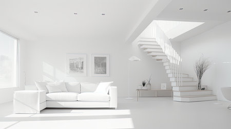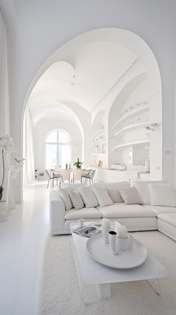 A pristine living room with white walls and elegant furnishings, exuding cleanliness and sophistication.