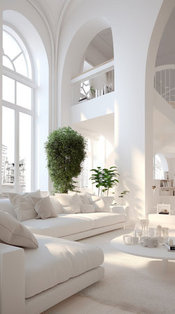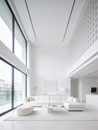 A bright, minimalist living room features white sofas, a white coffee table, and large windows letting in abundant natural light.