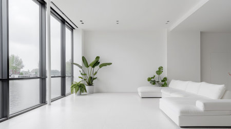 modern minimalistic interior design of light bright monochrome room with black and white furniture, clean white walls and huge windows