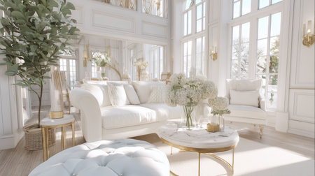 Luxury white interior of living spacious room with elegant chic furniture and high windows.