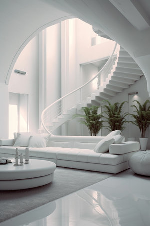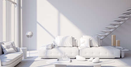 modern white living room with stairs, 3d rendering. Computer digital drawing