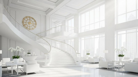 3d render of interior of modern living room with white walls, concrete floor, white round tables with chairs and wooden stairs