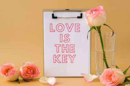 LOVE IS THE KEY text on greeting card paper note. Delicate pink roses on beige background. Minimal trendy composition. Romantic pastel pink rose flowers. Neutral earth tones. Preparation for Valentines day Modern stylish