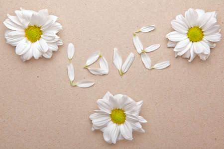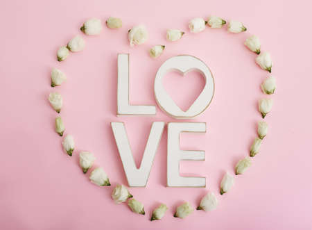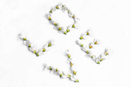 Word love made of white rose petals. Caption word love, inscription from the petals of roses. Weddind, love and romantic theme