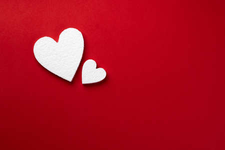Top view of white and red wooden handcraft heart symbol on white background. Valentine's day theme.