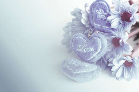 Love - word made of colored wooden cubes. Nearby there are two decorative stone hearts. Close-up. Top view. Copy space. Selective focus.