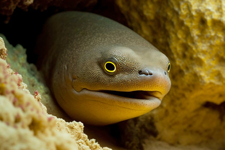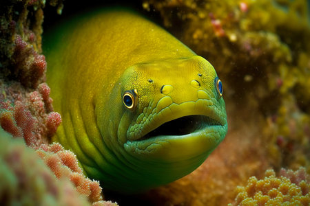 yellow green predatory moray eel lurks in burrow among corals