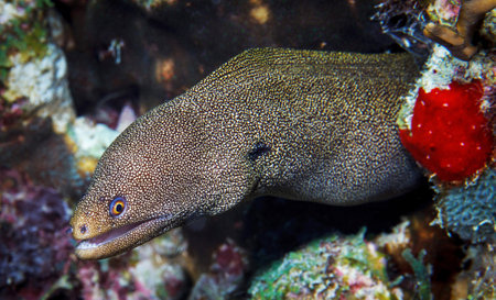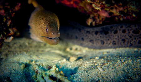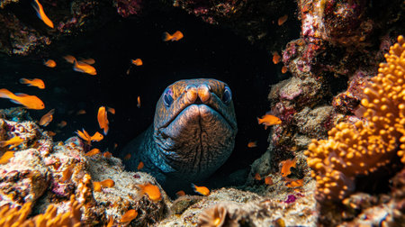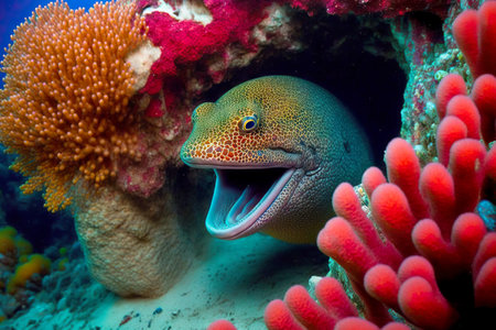 Dangerous ocean fish moray eels sit among reefs and corals