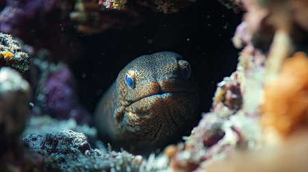 A captivating view of a moray eel emerging from its coral habitat. This underwater scene showcases the vibrant marine life and intricate details of nature.
