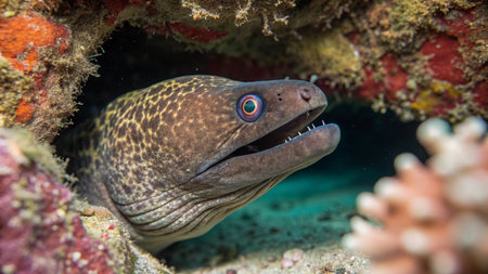 A dramatic shot of a moray eel peeking out from its rocky hiding place, its sharp teeth visible.