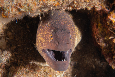 Moray Eel Peeking Out from Hiding Spot Close Up. Concept Underwater Photography, Sea Creatures, Marine Life, Close-Up Portraits, Underwater World